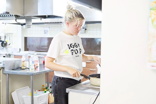 The large kitchen is spacious, easy to use and comes equipped with induction stoves. It is a place for fun and socialising while cooking together and sharing dishes from different countries.