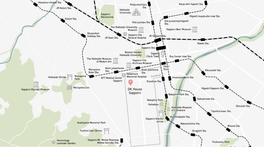 DK House Sapporo is surrounded by a wide range of convenient facilities such as convenience stores, supermarkets and banks. General hospitals such as Sapporo Medical University Hospital, NTT East Sapporo Hospital, Nakamura Memorial Hospital and Sapporo Minami Ichijo Hospital are a 5-minute walk away. It also takes just 10 minutes to reach Susukino and Odori Park. |