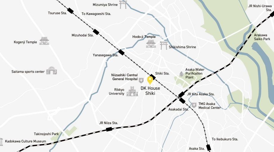 Located a mere 3-minute walk from the Shiki Station, our sharehouse offers easy access to Ikebukuro in 18 minutes or Shinjuku in 30 minutes via the Tobu Tojo Line, making commuting for school or work a breeze. The vicinity of the station offers all you need for your daily life, from supermarkets and drug stores to restaurants, shopping arcades and shopping malls.